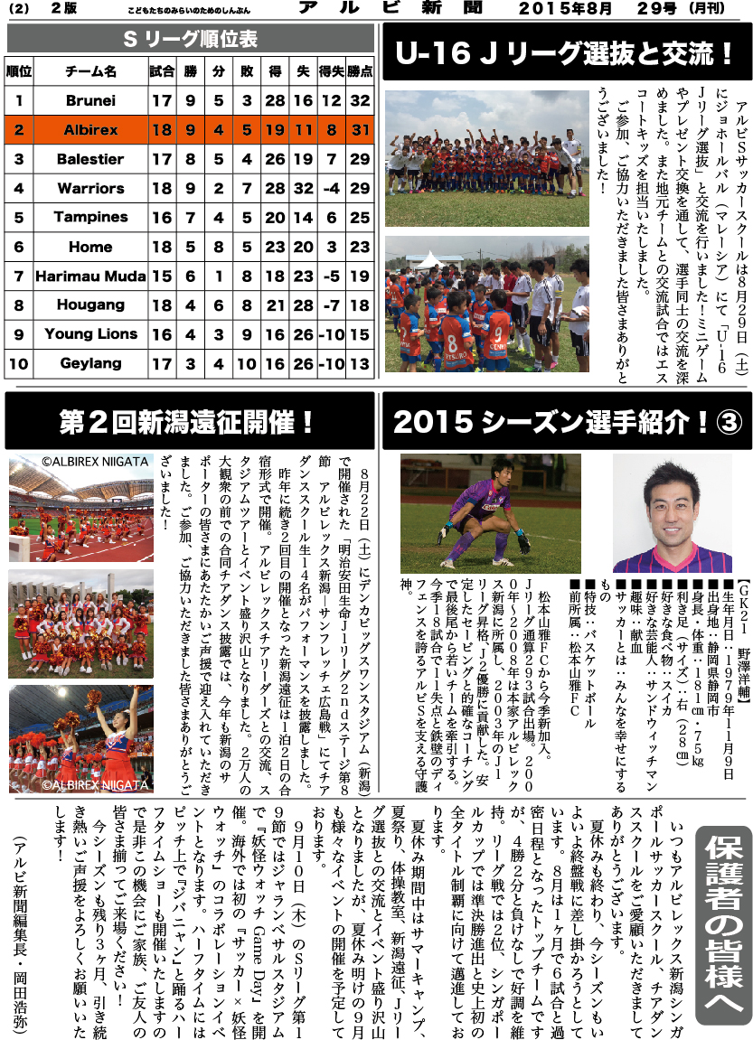 アルビ新聞【第29号】 2015.09.03 いつもALBIREX SINGAPORE SOCCER SCHOOLをご愛顧頂きありがとうございます。毎月配布しているアルビ新聞。【第29号】 を発刊いたしました! 土壇場の同点弾で2位を堅守したリーグ戦(Sリーグ)、U-16 Jリーグ選抜との交流(サッカースクール)、第2回新潟遠征(チアダンススクール)などアルビ情報盛り沢山となっております。 ぜひご家族の皆さまでお楽しみください!アルビ新聞【第29号】のダウンロードはコチラ 一覧