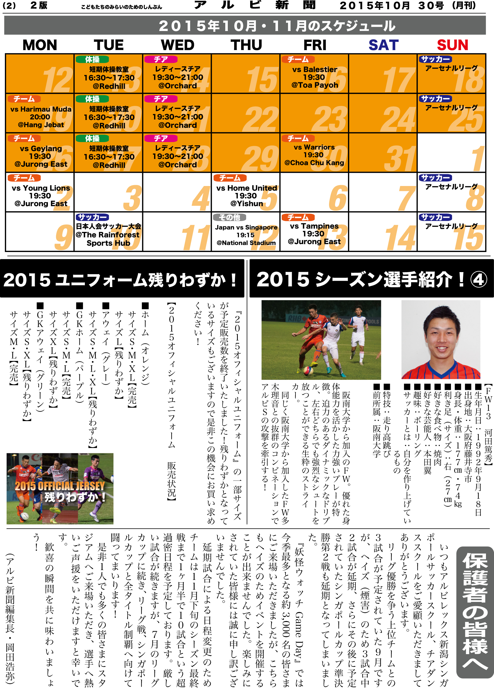 アルビ新聞【第30号】 2015.10.13 いつもALBIREX SINGAPORE SOCCER SCHOOLをご愛顧頂きありがとうございます。毎月配布しているアルビ新聞。【第30号】 を発刊いたしました! 4年ぶりの決勝進出へ王手をかけたシンガポールカップ準決勝第1戦(Sリーグ)、公式Instagramアカウント開設、短期体操教室開催などアルビ情報盛り沢山となっております。 ぜひご家族の皆さまでお楽しみください!アルビ新聞【第30号】のダウンロードはコチラ 一覧